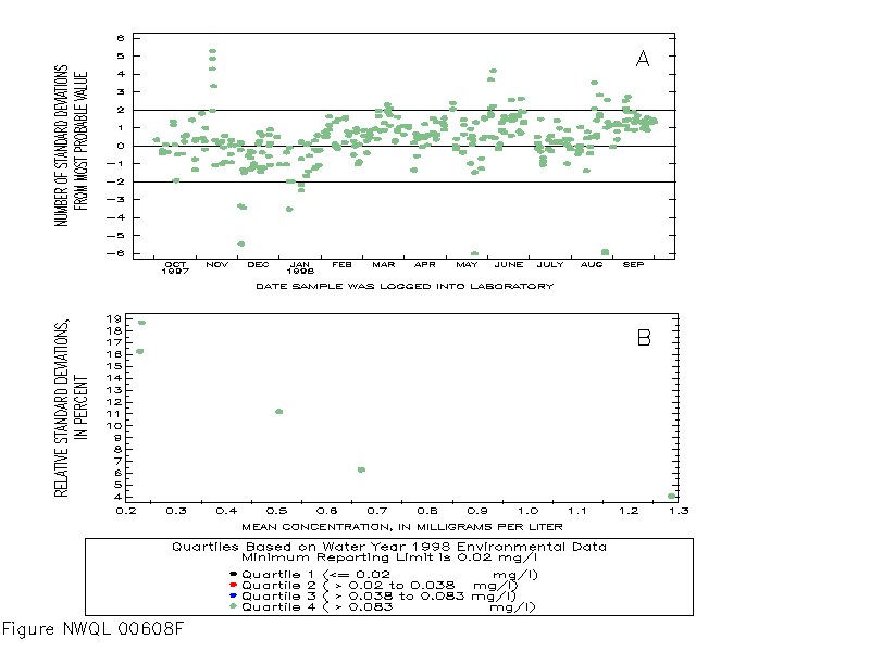 At the National Water Quality Laboratory during water year 1998, lack of precision was indicated for 2 of 17 nutrient procedures: ammonia as nitrogen (dissolved, colorimetric) and orthophosphate as phosphorus (dissolved, colorimetric). Bias was indicated throughout the reference sample range for ammonia as nitrogen (dissolved, colorimetric, low level) and nitrate plus nitrite as nitrogen (dissolved, colorimetric, low level).